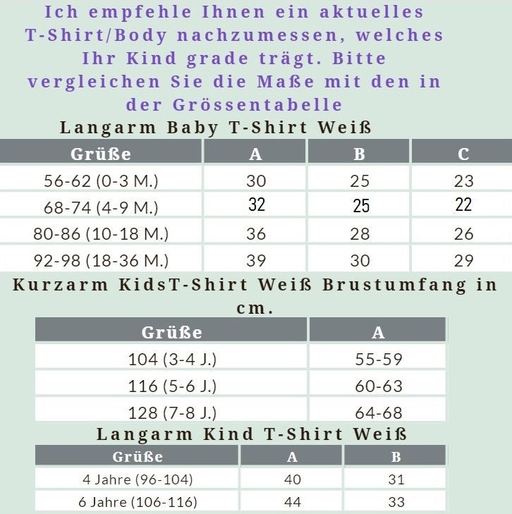 Bitte messen Sie vor dem Kauf die aktuelle Kleidung des Kindes, damit Sie die richtige Größe auswählen können.