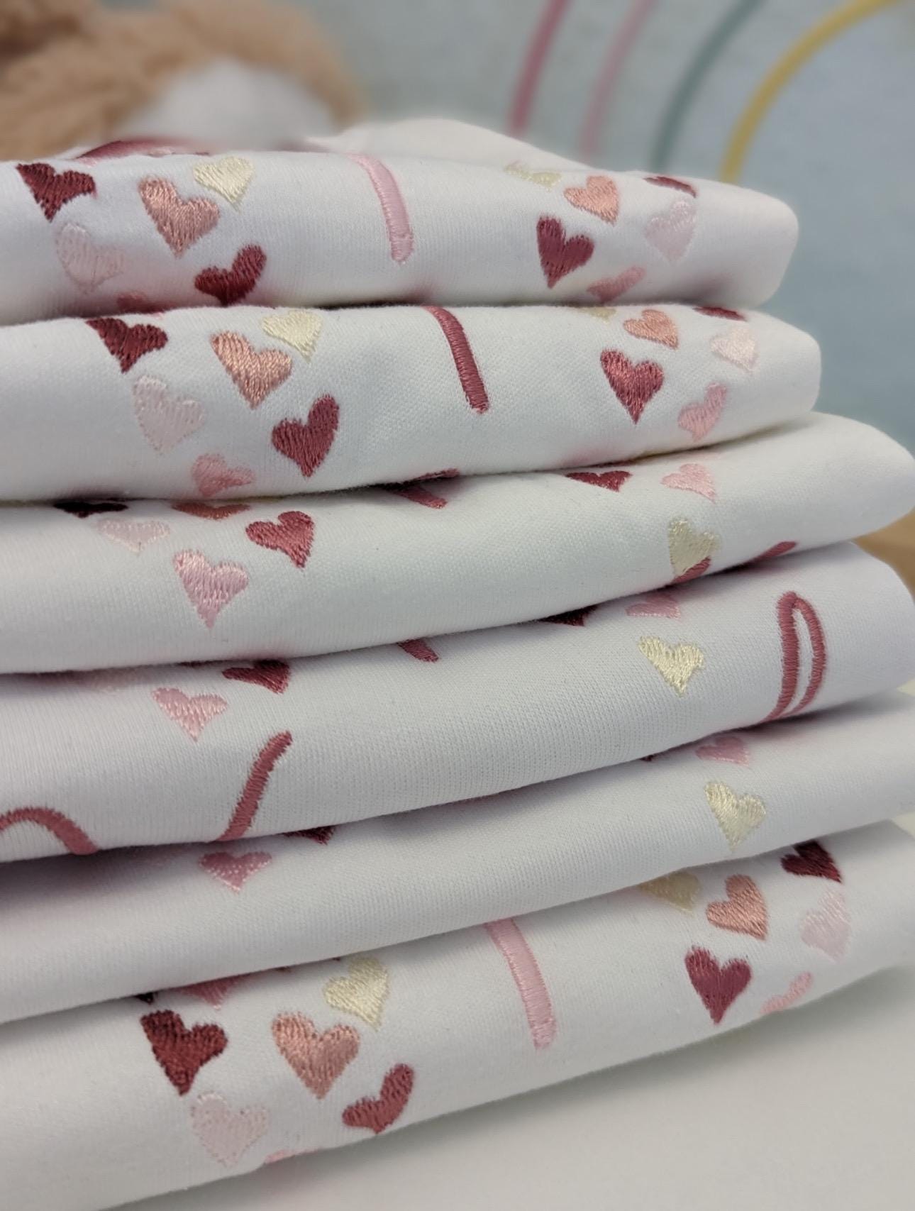 Die Rückseite aller gestickten Designs ist mit einem zarten Hauch bedeckt, um Reizungen der Haut des Kindes durch die Maschen zu vermeiden. Hinweis: Der Schutzstoff kann sich beim Waschen lösen.