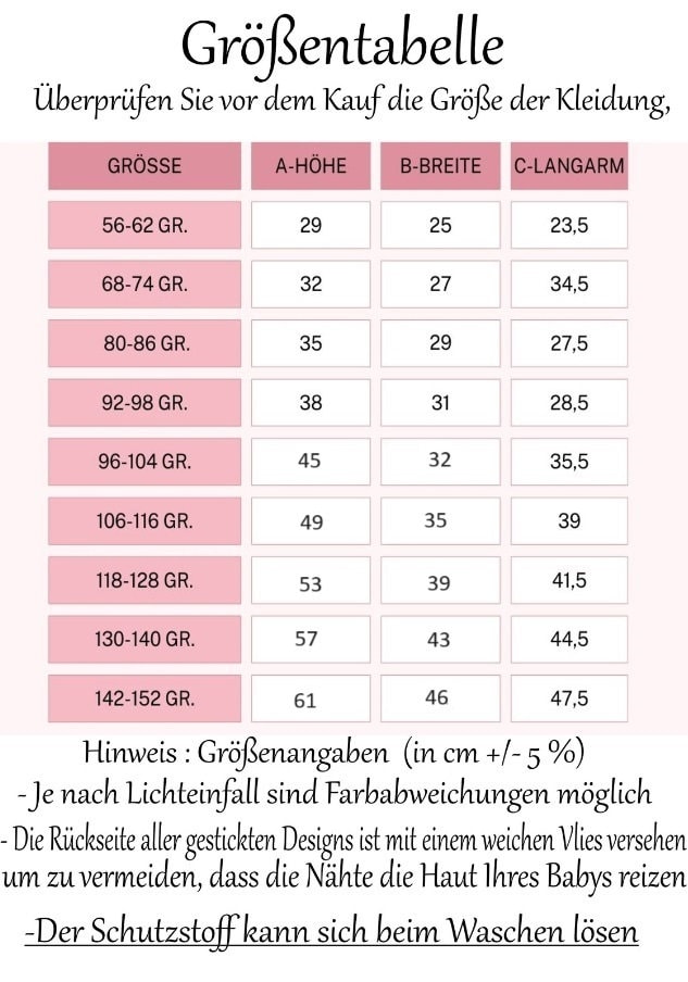 Bitte messen Sie vor dem Kauf die aktuelle Kleidung des Kindes, damit Sie die richtige Größe auswählen können.