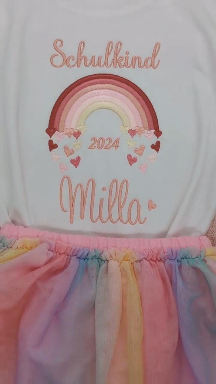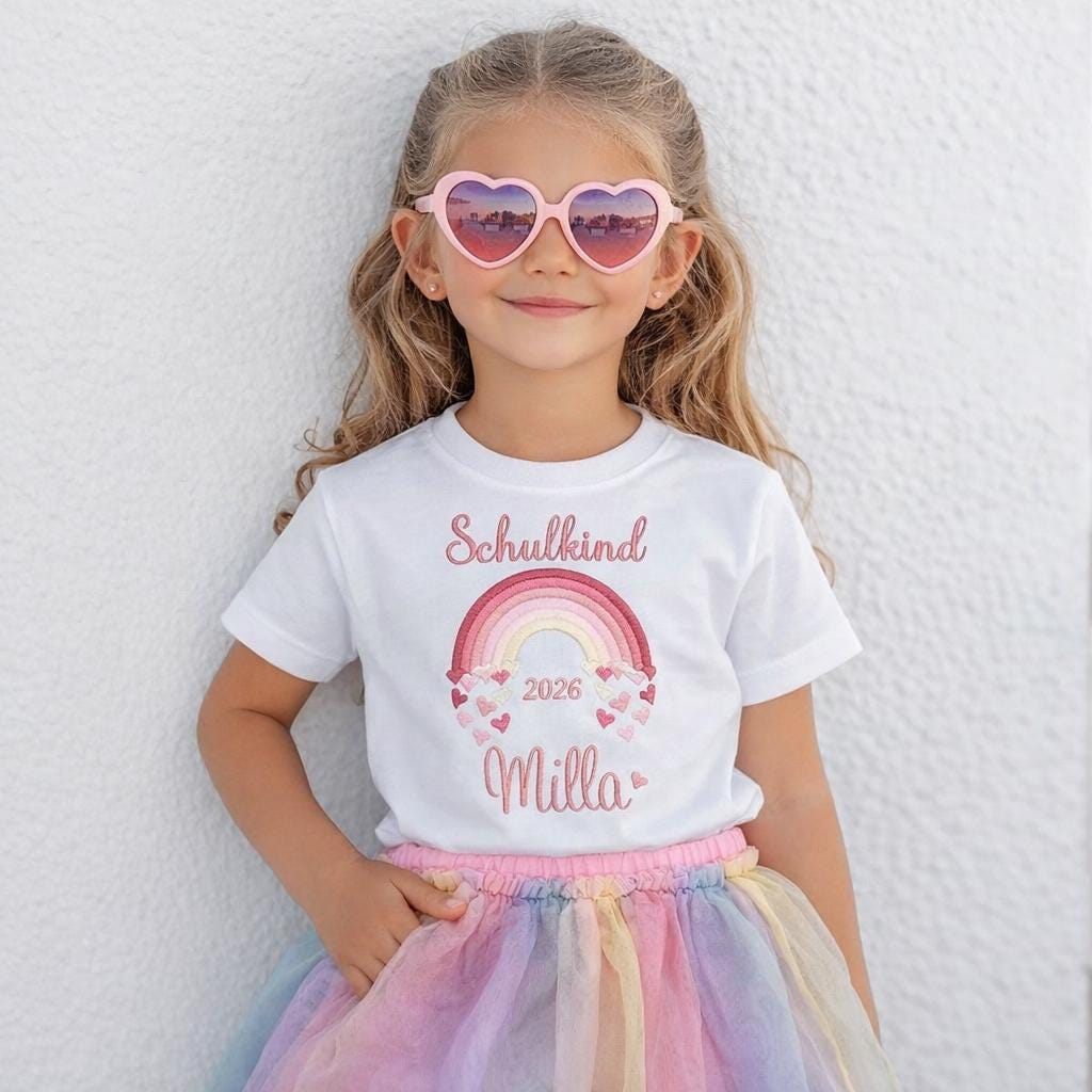 T- Shirt für Schulkind Einschulung 2026, Schulanfang Geschenk Shirt Regenbogen mit Name für Mädchen, 1. Klasse Schultag Schulanfänger,