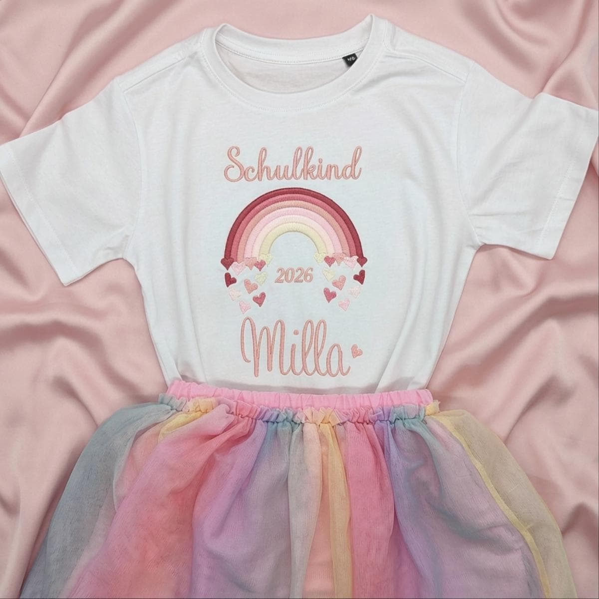 T- Shirt für Schulkind Einschulung 2026, Schulanfang Geschenk Shirt Regenbogen mit Name für Mädchen, 1. Klasse Schultag Schulanfänger,