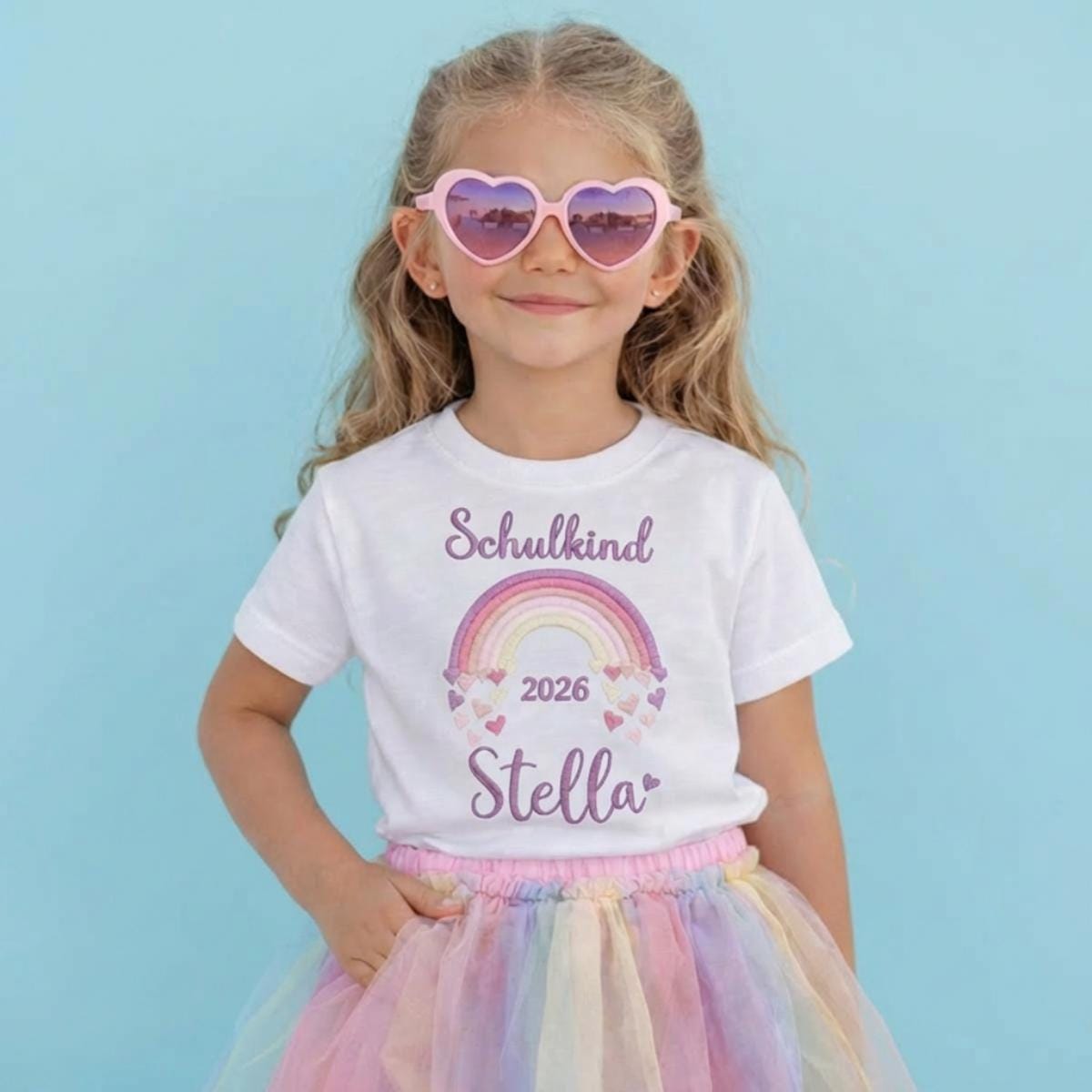 T- Shirt für Schulkind Einschulung 2026, Schulanfang Geschenk Shirt Regenbogen mit Name für Mädchen, 1. Klasse Schultag Schulanfänger,