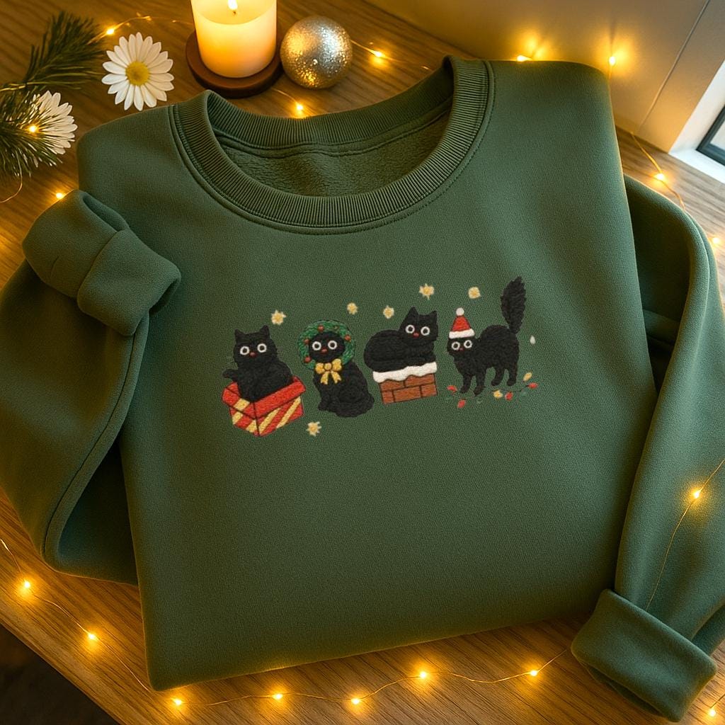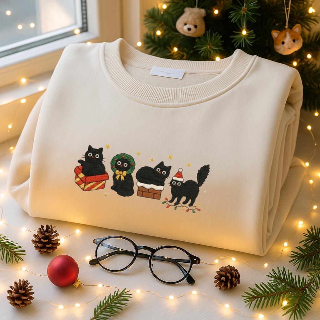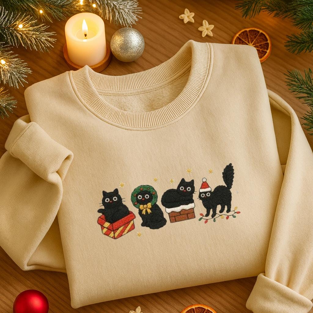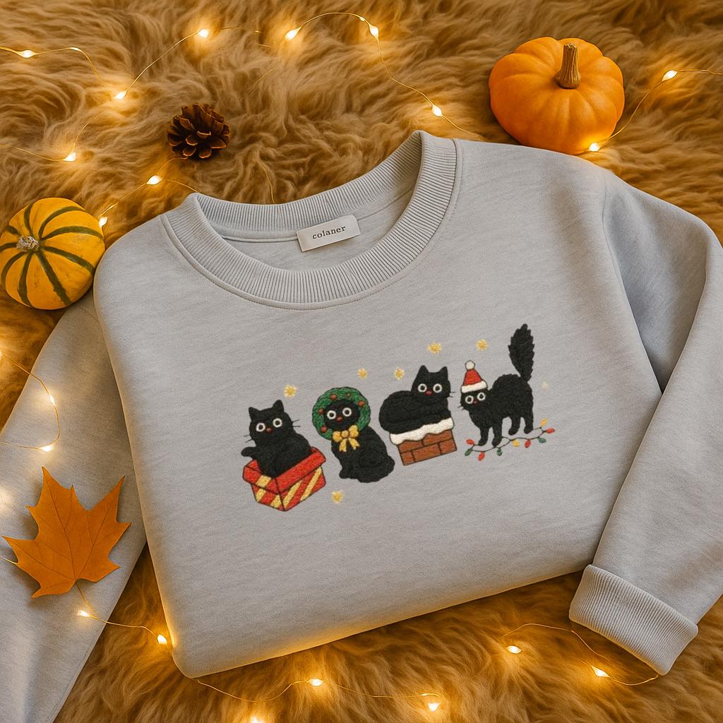 Dieser bestickte Weihnachtspullover mit Katzenmotiv ist die perfekte Mischung aus kuscheligem Winterkomfort, hochwertiger Verarbeitung und einem Hauch Weihnachtszauber.
