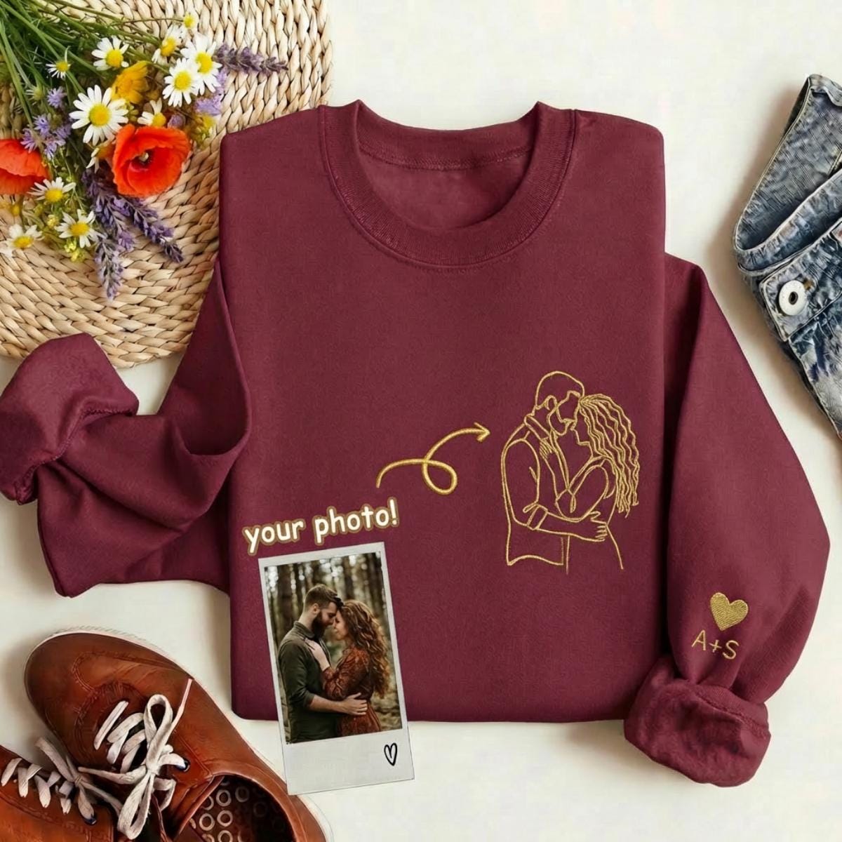 Paar T-Shirt mit Bildstickerei, personalisiertes besticktes Sweatshirt ,Valentinstagsgeschenk Foto Portrait bestickt für Paare, Hochzeit