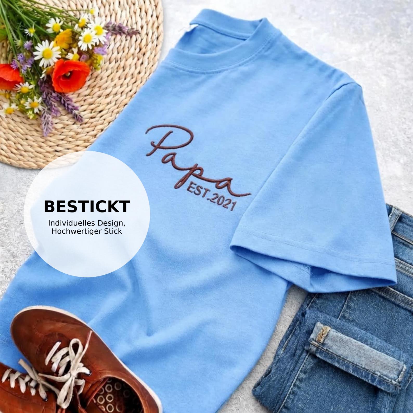Personalisiertes Väter Geschenk Papa T-Shirt bestickt mit Name & Jahr – Vatertag Geschenk Werdender Papa Ankündigung – Mama Oma Opa Shirt
